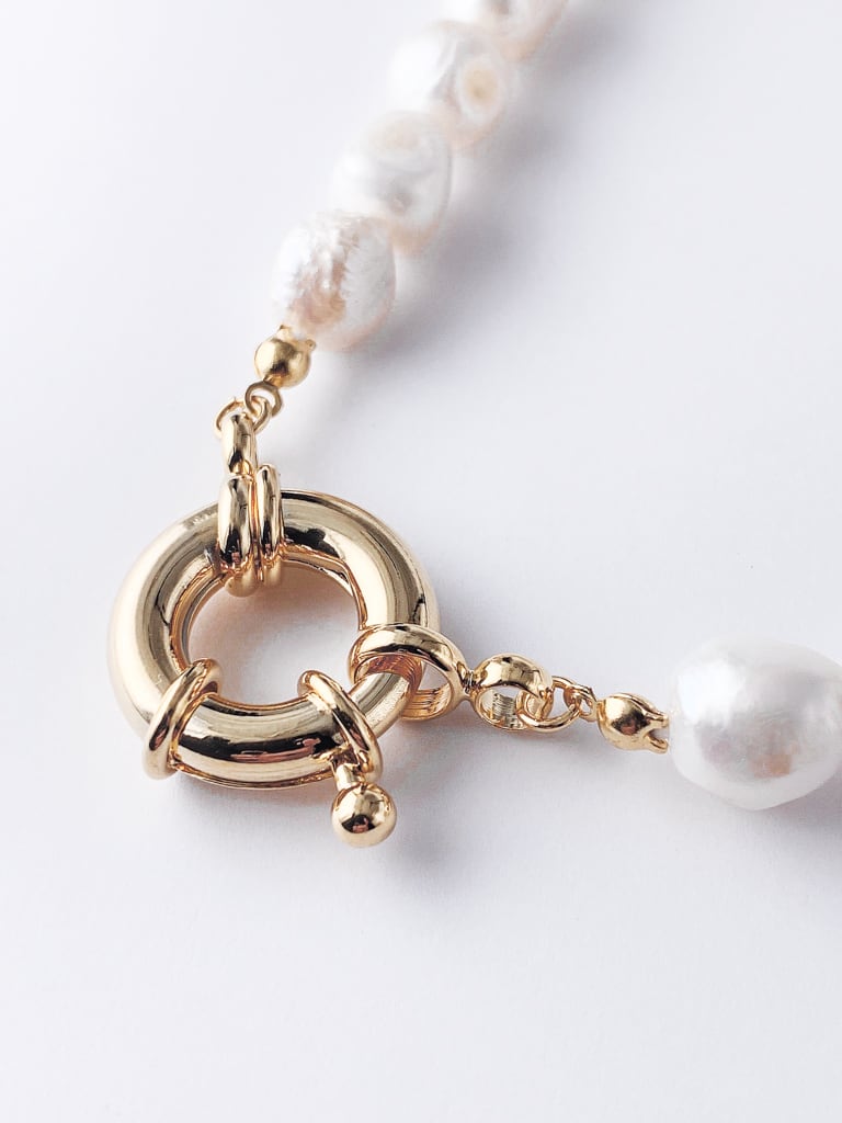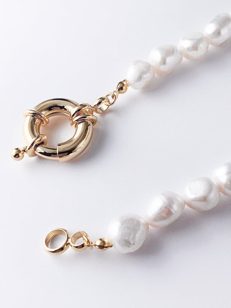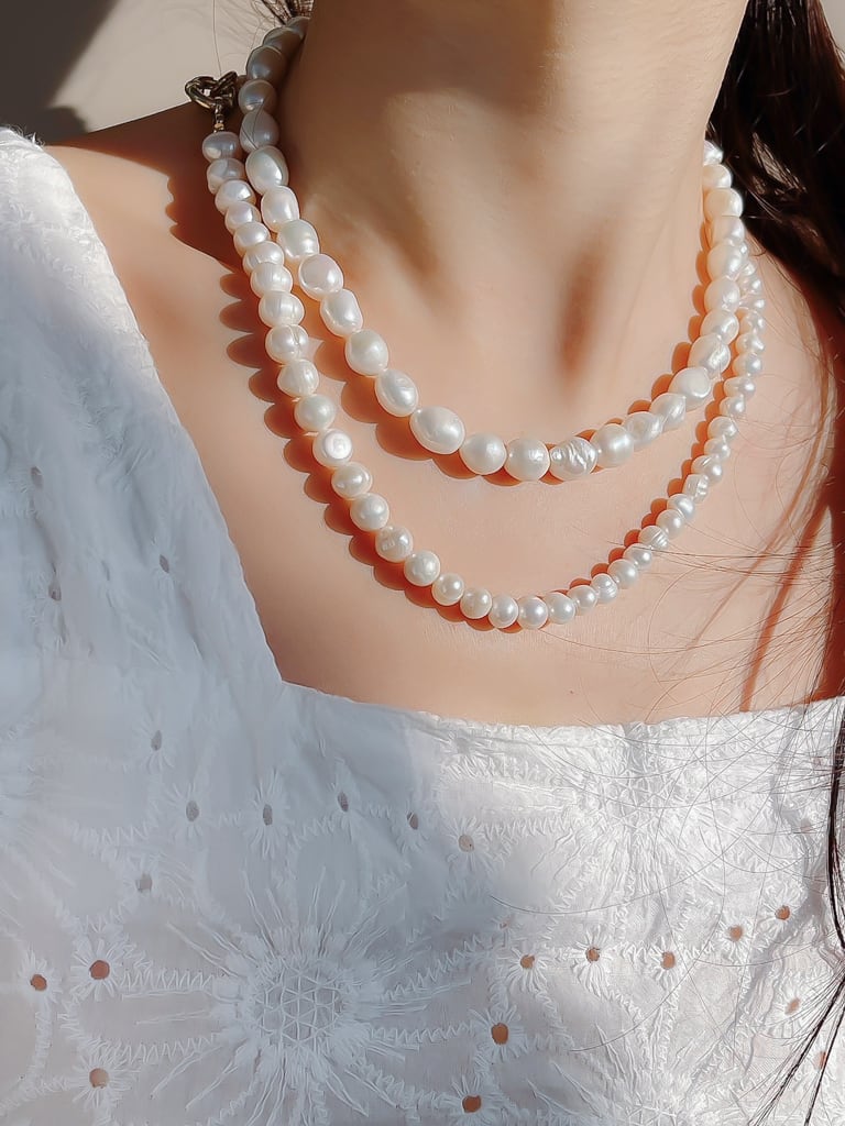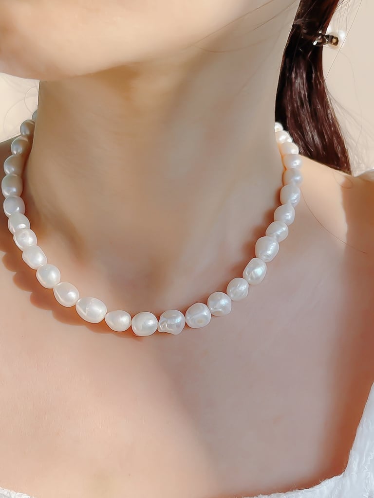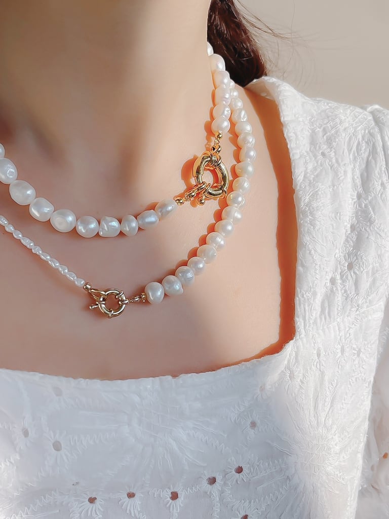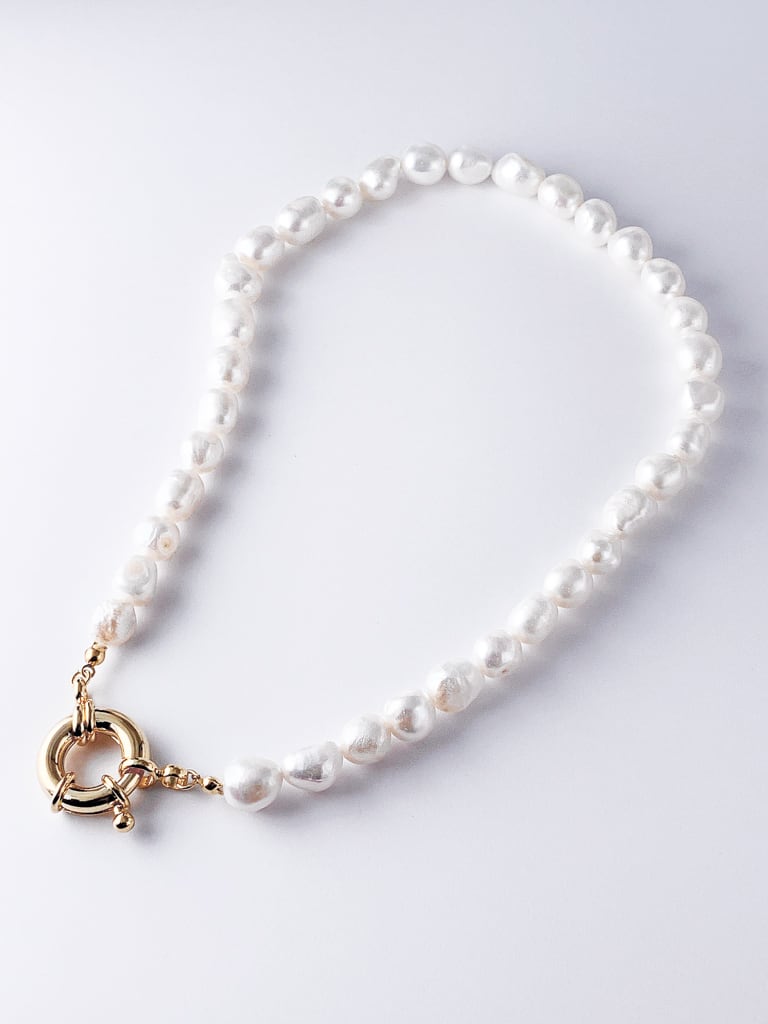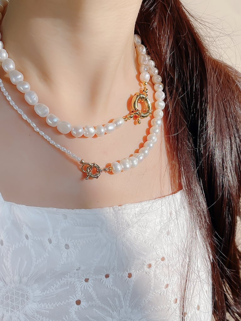 留め具にユニークなフックを使い、約10㎜の大き目な淡水真珠を繋げたネオクラシカルでエレガントな首元に魅せてくれる作品です♡