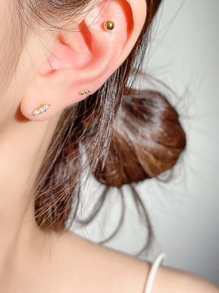 直径5mmの台座に3つの小さなパールをセットしたクールで繊細な印象を与える作品です^^